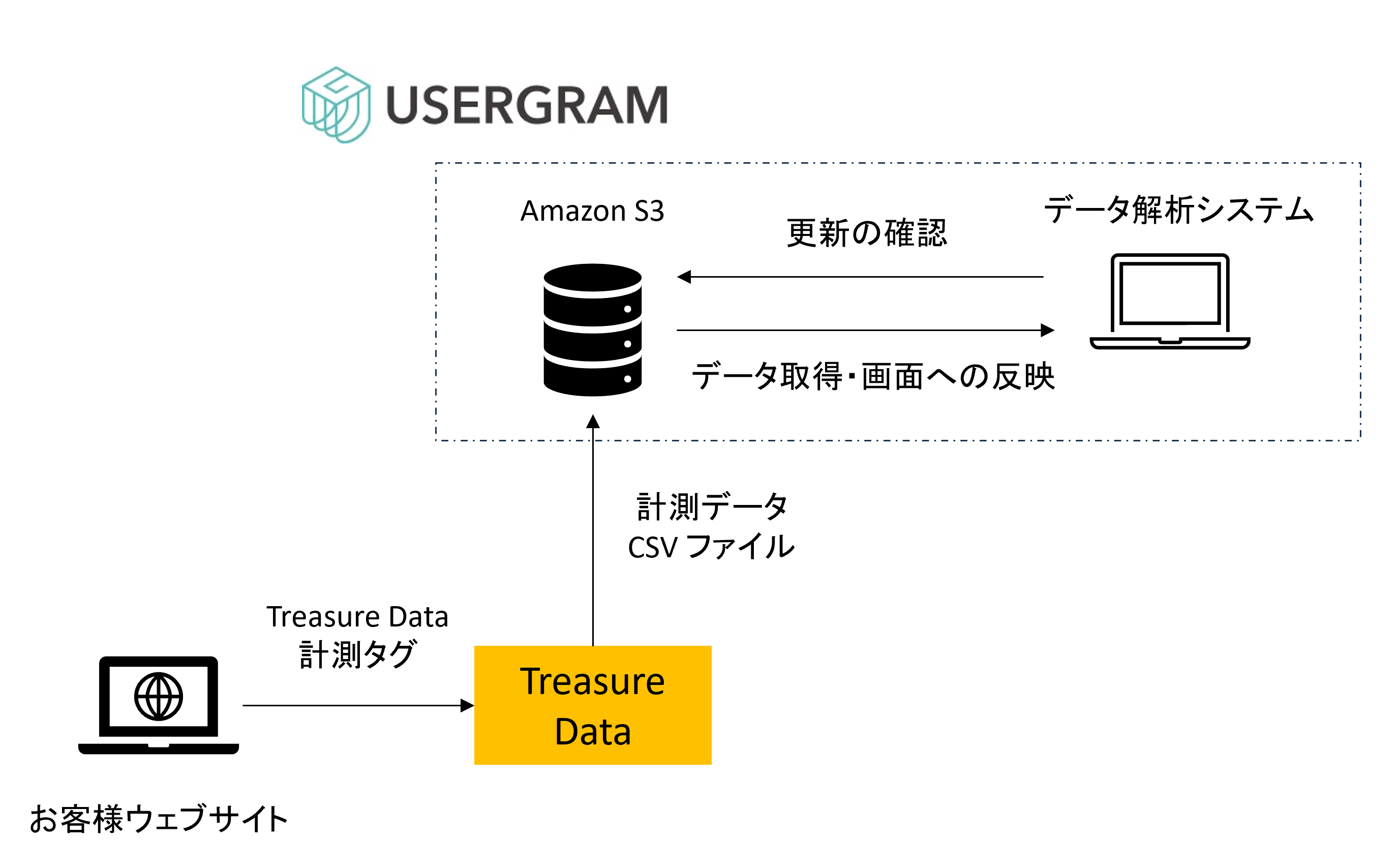 USERGRAMへデータインポートを行う際は、Treasure Dataで計測したWeb行動データを指定のフォーマットに沿ったCSVデータの形に出力いただき、Amazon S3経由でデータをアップロードいただく必要があります。